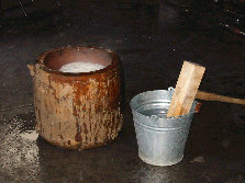木臼はもちが冷めにくく余分な水分は吸ってくれるというスグレモノ。隣のバケツは杵取り用の水。
