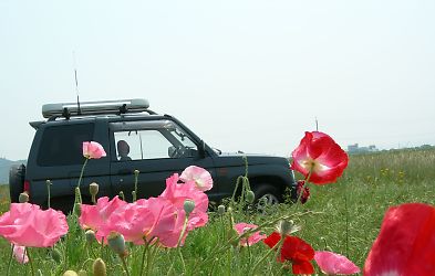 なんだ、びっくりさせるなよ。 そのまま進み続ける。 よっすぃー隊員が、情けない声で「むしぃ〜虫がぁ〜」と叫んでいるのは無視して。 彼女の頭の高さまである草の中をゴソゴソ進んでいく。 最初は先の見えない草の中&大量の虫に怖気づいていたよっすぃー隊員だったが、次第に慣れて…イヤ、置いて行かれまいと必死に、着いて来る。 住宅街や公園に、こんな背の高い草生えてないし、良い経験よね。 カズ隊員を抱っこして歩いていると、手当たりしだい草をむしっている…。 そして虫嫌いなよっすぃー隊員も最終的には、テントウムシやらモンシロチョウにビクビクしつつも、草の中を駆け回っていた。 結局そこらへんをごそごそ歩いて終わる。 まぁ、ニュースにもなった場所だから、生えてたらとっくに駆除されてるだろうけど。 代わりといってはなんだけど、ケシの仲間として、オリエンタルポピーのお花畑を発見。 へなちょこ1号を走らせていると、遠目から見ても赤い帯のようなものが見える。 結構な数である。 「かわいい〜」 赤やピンク、少しオレンジ掛かった色のオリエンタルポピーが、干拓の一角に咲いているのだ。 証拠写真として、カメラに収める。 |