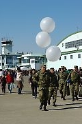 地上展示をみて回っていると、向こうから白い風船を持った隊員さんたちを発見。 しかもでかい。 さっきから、時々風船が飛んでいたが、犯人は彼らしい。 これは雲の高さを測ったり、風向きを観測するバルーンというやつか。 せっかくなので聞いてみると合っていた。 もうすぐ午後の部、第1空挺団による落下傘降下が始まるので、チェックしているようだ。 以前強風で見損ねたので、今回は見たいー! それにしても、ごつい体に白い風船、似合わなかったなー(笑) |