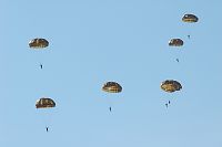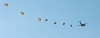 ■13:00、いよいよ午後の部が始まった。 ■空を見上げていると、会場左手から一機のC−1輸送機が登場。 ■まず偵察のために一つが落下、その後続けざまに投下される黒い物体。 ■その黒い物体から次々と落下傘が開く。 |