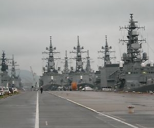 「おお〜、おるじゃん!!!」 ずらっと並ぶ護衛艦。 以前ロシアの駆逐艦が寄港した際は、こんなにいなかった。 それもそのハズだ、 全国の6基地を母港とする4護衛隊群から、 イージス艦の「みょうこう」「きりしま」など計22隻、 隊員約4000人が大・集・合! しているのだ。 ああ、一般公開、見たかったな〜。 でも仕方ない、いつもの行き当たりばったりな下調べ無しの出発だったので。 しかし後に、それをものすごく後悔することになろうとは…。 それはひとまず置いといて。 コンビニ帰りの自衛官にジロジロ見られつつ、フェンスの隙間から散々写真を撮った我々は、アレイからすこじま公園へ戻る。 |