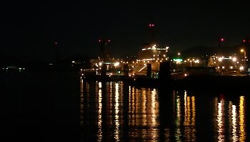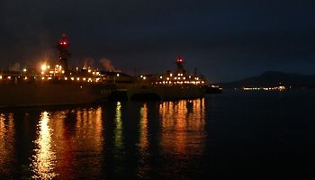 辺りが薄暗くなってきて、護衛艦の艦橋にぽつぽつと灯がともる。 |