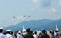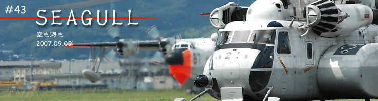 掃海・輸送ヘリMH-53Eが、ススが付いたように灰色なのが、いつも気になるのだが聞く術が無く、何であんな色なんだろうね、まさかわざと?とか、実はああいう迷彩?とか、馬鹿なことをつぶやきつつ眺める。 |