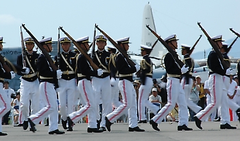 「ハイ、今現着です〜。もー、ホントご心配お掛けしてすみません〜」 電話を切る。 急いで会場へ向かう。 8時に岩国入りした我々は、どこかに靴が売ってないか探す。 しかし24時間営業の店など付近にはなく、9時の開店を待ち靴を購入、駐車場へ向かう。が、進まないテールランプの行列の最後尾を確認したタイチョーは、駅前の駐車場に4号を停め、臨時バスで現地入りするというpark-and-ride方式に作戦を切り替えた。 それが功を奏し、なんとか祝賀飛行の一部には間に合いそうだ。 バスは、海上自衛隊岩国航空基地のコンストラクターゲートで一時停止すると、荷物検査を待つ自家用車の長蛇の列をすい、と抜け、基地内に入っていった。 |