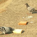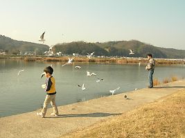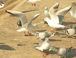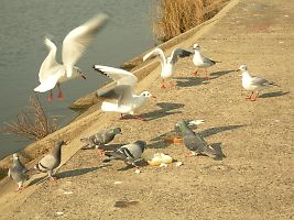 エサの切れ目が縁の切れ目とでも言うかのように、袋の中が空になったことを知ると、一斉に飛び去っていく。 |