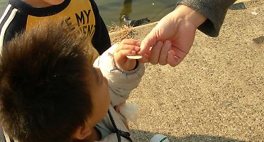 レジ袋を片手に川沿いを歩いていると… 「ギャアギャアギャア」 何処からとも無く近づいてくる鳥の鳴き声。 カモメだ。 冬場になると、カモが渡ってくるこの河川敷で、餌付けをしている人を良く見かける。 カモメもまた同じく餌付け対象として人気なのか、よく慣れている。 こうしてレジ袋をぶら下げて歩いていると、どこからともなく集まってくるのだ。 さらにレジ袋に手を入れてみたり、ボールでも投げるフリでもすれば、あっという間だ。 「よし、じゃあ調査を開始しようや」 そうた隊員に手伝ってもらい、準備をする。 |