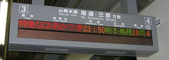| ▲この表示も今日が最後の表示。本来あかつきは、長崎行きだが、ダイヤ改正の関係で最終列車は鳥栖止まり。 それにしても、行き先が、熊本・鳥栖というのが、スケールがでかくてイイ! |