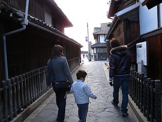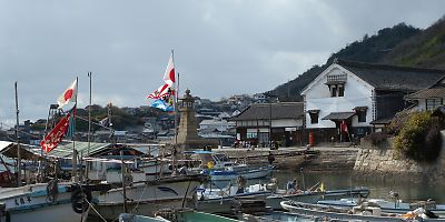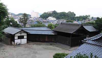 左は、鞆で最も有名であろう太田家住宅(おおたけじゅうたく)の前を歩くタイチョーとU子隊員、U大隊員。 |