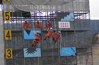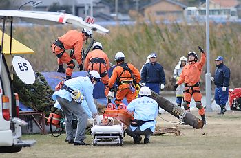 化学防護服を着た隊員たちが救助へ。 そして右にある黄色いテントで、汚染物質を洗浄するのだそうだ。 地震の影響で、付近の家屋が倒壊。 すぐに救助に向かう隊員たち。 瓦礫の中に、要救助者発見! クレーンで電柱を取り除くと、要救助者を無事救出。 |