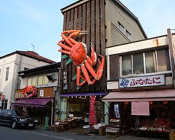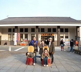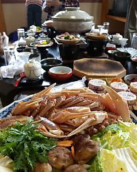 2階の客室に案内され、座敷に座る。 焼きカニが運ばれてきて、まずは食前酒を一杯。 清酒に漬け込まれたという梅酒は甘くて、急にお腹が騒ぎ出した。 さて食べるぞ〜。 無言で食べ続けること約2時間半、焼きが二、カニや白えびの刺身、カニ味噌、白エビの陶板焼き、但馬牛ステーキ、そしてメインのカニすき! まさにかにカニプランである。 もうカニはいいわという頃、時間に気付く。 そろそろ観光に出かけないと…! 宿を後にした我々は香住駅に。 しかしソコが先述の“人もまばらで、静かで小さな駅”であることを忘れていた我々は、次の電車が来るまで、約40分待つことになる。 時間見といてよ、タイチョー!と思うが後の祭りである。 そして城崎に到着したのは16時過ぎ。 なんと、帰りの列車の発車時刻まであと約1時間と少し。 でもせっかく城崎まで来たのに〜〜〜〜、という事で、足湯だけでも入ろうと、改札を出た。 |