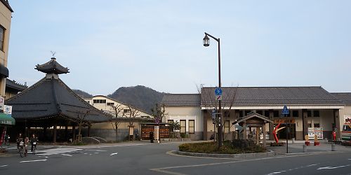右の建物が駅舎、左側の奥にあるのが足湯なのだ…。 |