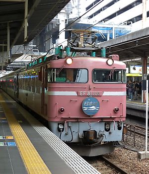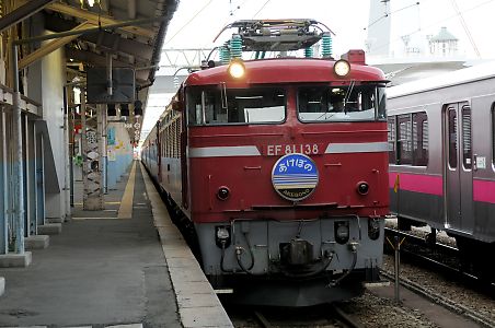 敦賀では、カマ交換を見学。 雨の中、興味津々のカズ隊員。 (写真下部のアタマはカズ隊員のもの。見てる見てる) 「富士・はやぶさ」の時には人だかりが出来ていた「イベント」だが、今回は我々のほかに1人居ただけだった。 (さぞや痛い家族に見えたことだろう!) 日本海縦貫線は、50Hzと60Hzの交流区間、直流区間の入り混じる路線なので、切り替わるたびに専用の機関車に交換していると、3回もイベント(笑)が発生してしまうため、交流区間と直流区間を直通して走ることの出来る、交直両用機関車「EF81」が引っ張っている。 しかしそれを何故今更わざわざ敦賀で、しかもEF81からEF81に交換するのかは不明…。 アレかな、疲れたからかな…。 オレを越えていけ、みたいな?(ちがいます) |