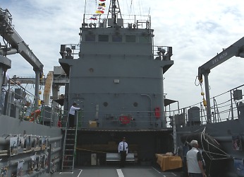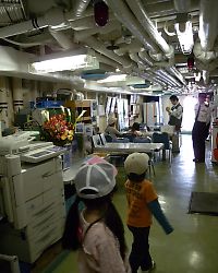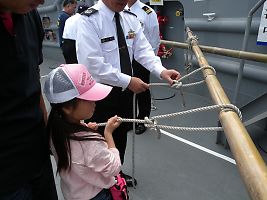 「ゆら」は、最小の「艦」なのだそうだ。これより小さいものは「艇」と呼ばれるらしい。 輸送艦だけあって、中には物資を載せるスペースが取ってあった。 そこで、写真の展示と、「ロープの結び方講座(?)」が行われていた。 よっすぃー隊員も挑戦! 「ここをこう持って、向こうへ回す…」 簡単そうにして見せてくれるのだが、「ここ?こう?!」よっすぃー隊員大苦戦。 「お母さん、手伝ってあげてください〜」 よっすぃー隊員のあまりの手際の悪さに苦笑い。 「え?ここですか?あれ?あれれ?」 まぁ親子ですから…。 |