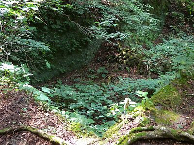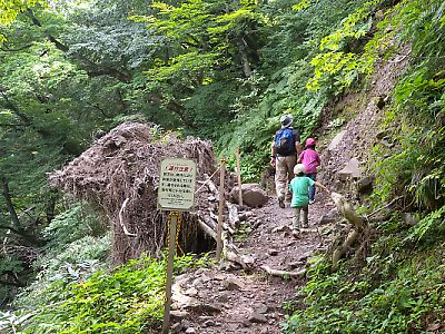 途中、木が倒れていて、斜面が崩落しているところも。 |