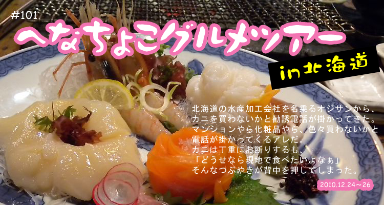 そして2010年12月24日、 新千歳空港へと降り立った我々へなちょこグルメ探険隊。 よっすぃー隊員とカズ隊員は、初めての飛行機と空から見る一面真っ白な雪景色に大興奮。 飛行機大大大嫌いなワタシはテンション↓↓↓。 それでも久々の北海道に、ワクワクドキドキしていた。 そんな落ち着きのない3人を他所に、「なんか食おうか」と一人フツーにお腹がすくタイチョー。 |