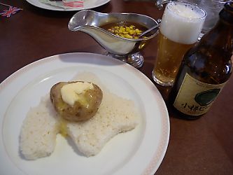 | ということで、まず昼ごはん。 新千歳空港内の「キタカレー」にて。 小樽でもないのに『小樽ビール』 地ビール独特のクセと、きれいな色が食欲を誘う。 そして『北海道カレー』 北海道のカレーと言えば、スープカレーが有名だが、見た目重視であえて『北海道カレー』(笑) ライスが北海道の形に盛られ、熱々のじゃがバターが乗っかっている。 そしてグレイビーボートの中のカレーには、コーンがいっぱい。 ジャガイモも、バターも、コーンも北海道っぽいではないか!!! |