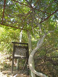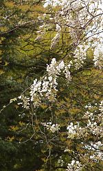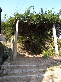 福山市沼隈町常石の敷名浜から厳島神社へ上る参道入口に、「千年藤(ちとせふじ)」と呼ばれる藤の木がある。 |