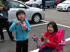 翌朝、目を覚ました我々は、車から出て驚いた。 「わっ、めちゃくちゃキレイなんですけど!」 夜中に着いたので、外の景色が見えなかったのだが、明るくなってあたりを見渡すと、一面の黄葉。 もうここだけで十分印象的な景色だったのだが、せっかく来たので行かなきゃね。 朝ごはん(朝からカップ麺は基本)を済ませ、しっかり着込んでいざ出発! 目指すはタクシー乗り場?! |