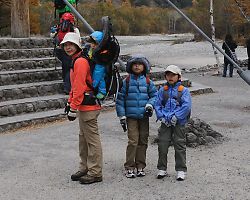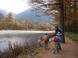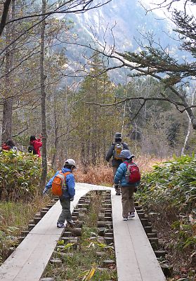 時計に目をやり、太陽の位置を確認していたタイチョーが、すれ違う人に話しかける。 「ここから徳沢ってどのくらいあります?」 「ん~、まだもう少し、結構あるよー。」 現在15:00。 さてどうする? 山の日没は早い。 帰りは疲れてもっと時間がかかるかもしれない。 そう思うと、このまま徳沢に向かったとしても、帰りが不安だ。 |