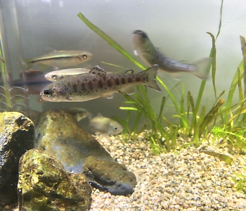 同居のヌマムツと仲良く6匹のニジマスが泳ぐ姿は最高!